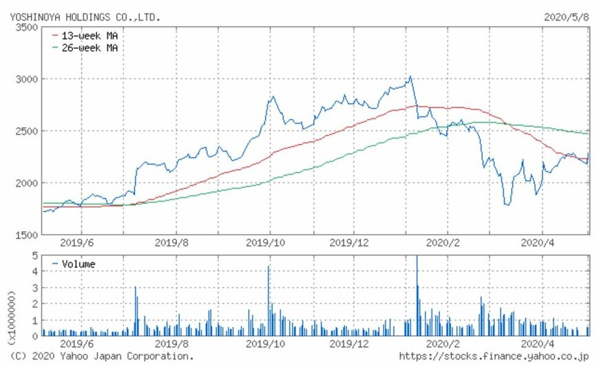 シリーズでお伝えしている「注目小売店月次実績」。今回は牛丼チェーン店「吉野家」他を運営する吉野家HD(9861)の、2020年4月の月次動向及び過去実績、また過去1年の株価動向について振り返ってみましょう。