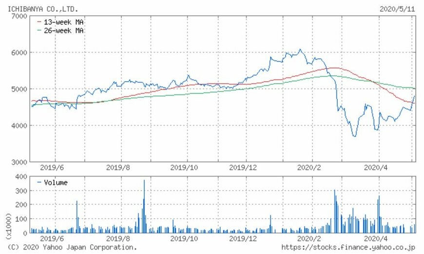 同社の株価は2018年12月の3,815円を安値に上昇しており、2020年1月には6,130円の高値に到達しています。その後反落する中で2月からの株式市場全体の下落も重なり、3月には3,530円まで下落しました。