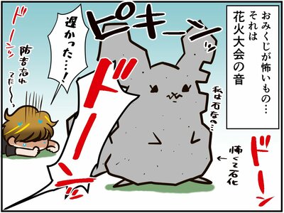 今日が何の日かを思い出した祭さん。大慌てで家に向かって走り出します。息を切らして部屋に駆け込むと、そこにはすでに石と化したおみくじちゃんの姿…。