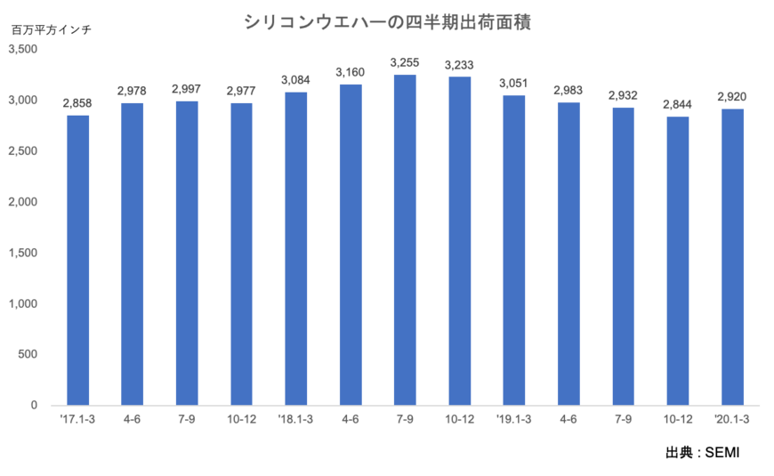 業界団体SEMIの統計によると、2020年1~3月期のシリコンウエハー出荷面積は前四半期比2.7%増の29.2億平方インチとなり、6四半期ぶりのプラス成長を記録した。新型コロナの影響からマクロ環境が悪化しているにもかかわらず、出荷面積が伸びたのは先端ロジック向けの300mmウエハーの需要が好調だったことに加え、顧客側で供給不安の心理が働き、在庫積み増しの動きを強めたことが背景にあると考えられる。