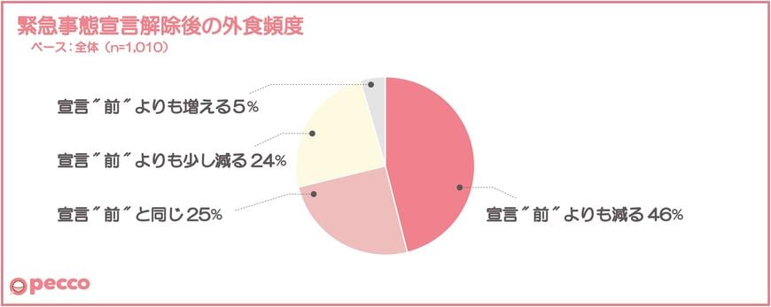 家にある食材だけで作れるレシピアプリ「pecco(ぺっこ)」を運営する㈱GEEK WORKSの「緊急事態宣言解除後の食生活の意識変化について調査」(調査対象:全国の10代~60代以上の男女、回答数:1010名、調査期間:2020年5月15日(金)~18日(月)、調査方法:インターネットリサーチ)によると、緊急事態宣言が解除された後の外食の頻度は「緊急事態宣言前よりも減る」が46%、「緊急事態宣言前よりも少し減る」が24%となり、「減る」と回答した人は全体の70%となりました。