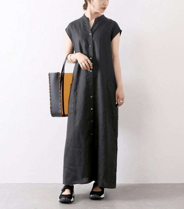 Iラインシルエットが大人っぽいオールブラックコーデ。エアリフトを外しに1点投入するだけで、シンプル過ぎず凝った印象になります。