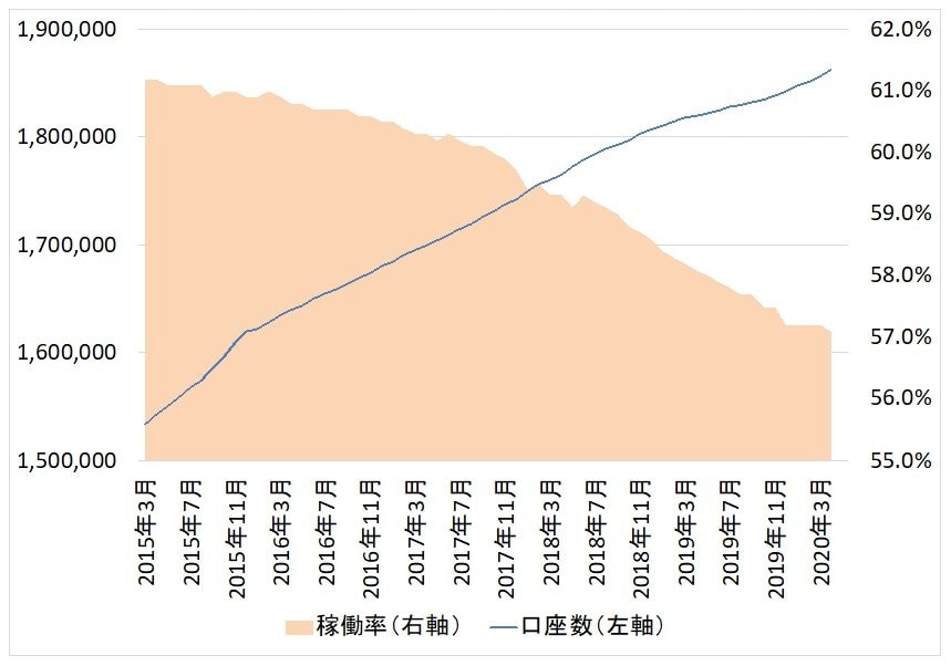 一方、稼働率(各月末時点で預かり資産、または過去1年間に取引があった口座の割合)は61.2%から57.1%へと、わずかに減っています。ここ5年でもピークが6割程度ということは、4割は非稼働、つまり口座開設はしたものの結局残高ゼロか取引をしていないかのいずれかです。