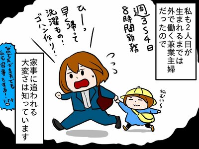 主夫になったとはいえ、さすがに無収入のままというわけにもいかず、週3日だけ仕事にいくことになった夫。さて、仕事と家事の両立やいかに…⁈