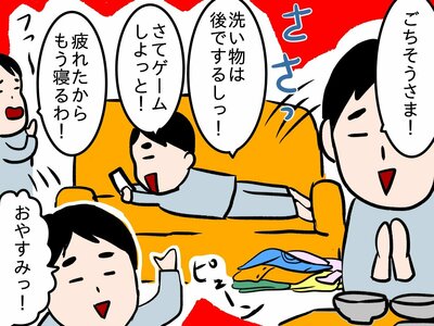 それでも主夫なので、基本的には家事は夫の担当。ただ、ねこねこむさんも、これまで仕事と家事の両立の大変さは嫌ほど味わってきています。だから、普段からもできる家事はやっていますし、夫が仕事をはじめてからも、仕事の日は晩御飯担当をかってでるなど、積極的に家事に参加。ただ、夫の帰りは会社員時代より早いので、後片付けなどは夫に任せられるのだろうと期待していました。