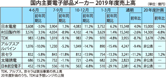電子部品業界は新型コロナによる需要減の前から、米中貿易摩擦による厳しい事業環境が続いていた。19年度(20年3月期)通期ベースでの業績は在庫積み増しの影響もあり、コロナの影響はそれほど表面化していない -