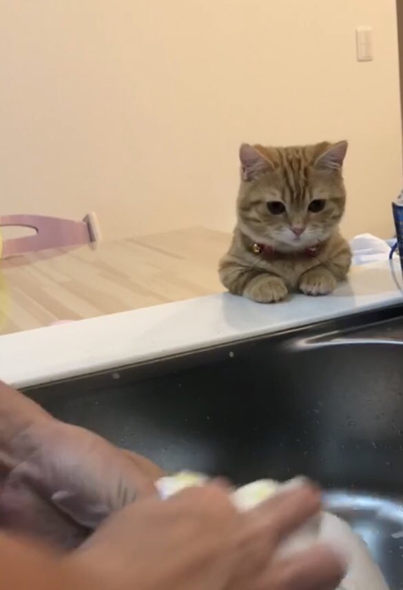 キッチン台にちょこんとおててをかけながら真剣なまなざしをスポンジに向けるぷてぃこちゃんはもしかしたら、ぷっちょさんが猫の手を借りたくなった時のために家事を習得しようとしていたのかもしれません。