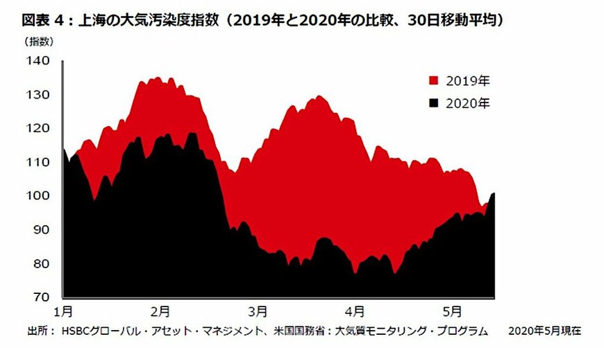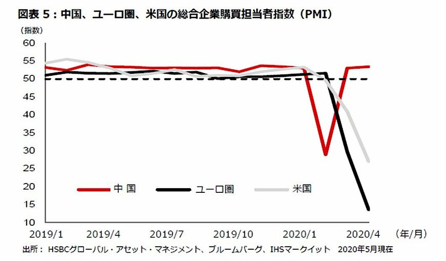 一方、「中国経済は、今後数四半期にかけて、他の国/地域を大幅にアウトパフォームする」というコンセンサス予想は妥当とみられる。これは、中国は新型コロナウイルス拡大の抑制に成功したとみられ、他国に先駆け経済活動を再開しつつあるためだ。経済活動の回復は、大気汚染度指数が通常の水準に近づいていること(図表4)、また企業の購買担当者指数(PMI)が力強く回復していること(図表5)に反映されている。