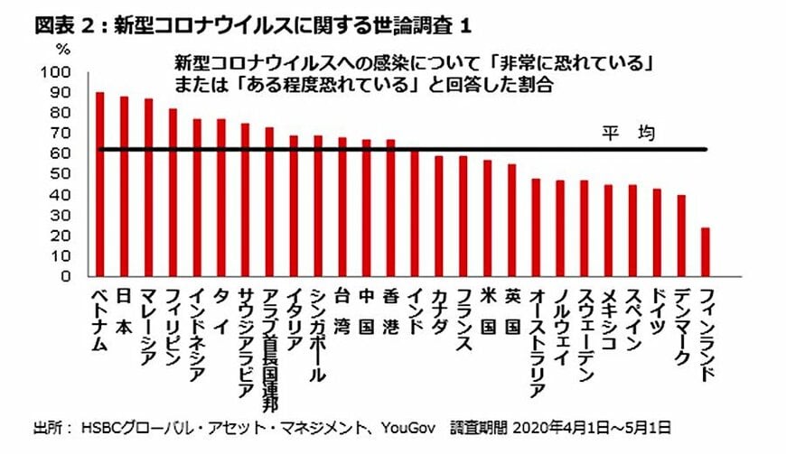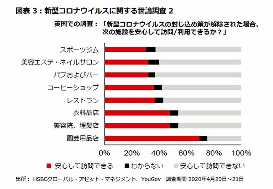 HSBC投信は、この先予想される消費者行動や企業行動には、下振れリスクがあると考える。たとえば、最近の調査によれば、人々は新型ウイルスに感染することを心配しており、この先の消費行動も慎重になる可能性が高い(図表2、図表3)。さらに、新型コロナウイルス封じ込め策の実施期間が予想より長引き、景況が一段と悪化するリスクがあると当社では考えている。