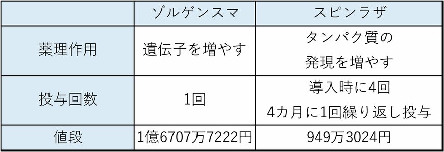 『スピンラザ』は、『ゾルゲンスマ』と同じ脊髄性筋萎縮症の治療薬ですが、遺伝子を増やすのではなくタンパク質が生まれる確率を増やす作用の薬です。『スピンラザ』は1回の値段は949万3024円ですが、繰り返し投与が必要なため11倍の値段である、1億422万3264円が基準と考えられました。