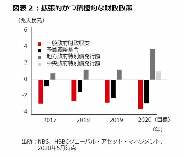 財政支出の優先順位は、内需回復に焦点が当てられており、とりわけ、医療支出および企業/中小企業支援、「新しい」インフラストラクチャー(例えば、グローバル・テクノロジー推進計画を実行するための5Gネットワーク、産業用インターネット、データセンター、新エネルギー車(NEV)充電ステーションなど)や新しい都市化(例えば、2019年の目標19,000に対し39,000の古い都市コミュニティのリノベーション)などの「効果的な」投資に重点が置かれるだろう。