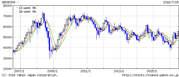 ボベスパ指数はリーマンショック前に高値を付けましたが、リーマンショックで急落し、次いで急反発しました。しかし、その後高値を更新することなく5年以上にわたってじり安の推移になっています。