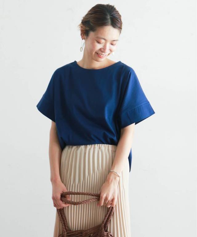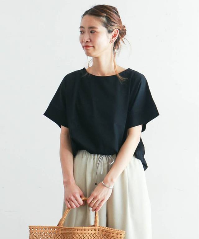 袖口が広く、腕をほっそりと見せてくれるところも嬉しいポイント。ネックラインはすっきりと開きが控えめで、ラフ過ぎず上品な印象に。