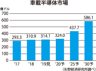 国内の大手調査会社によると、2018年の車載用半導体の世界市場は前年比6.0%増の310億9000万ドル、19年は同1.0%増の314億1000万ドルとなった。19年は、ADASやEV向けが牽引するセンサーやパワー半導体、メモリーが堅調に推移したものの、新車販売台数のマイナスによりMCUとアナログICの成長が鈍化し、前年からほぼ横ばいにとどまった。市況としては、踊り場にある車載半導体市場だが、ADASの先にある自動運転や電動化に向けた技術開発投資は、各社で積極的に進められている。30年には自動車販売台数のうち約10%をレベル3以上の自動運転車が占めるとみられ、車載コンピューティングを含めたシステムの高度化がさらに加速していくことになる。