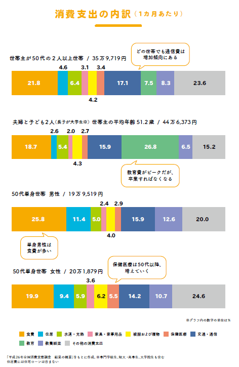 ちなみに下に示したグラフは、50代の消費支出の内訳の代表例です。