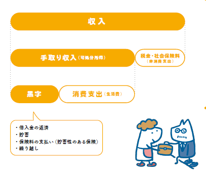 会社員は税金と社会保険料を給与から天引きされ、自営業者などは自分で支払います。税と社会保険料を引いた残りが手取り=可処分所得となり、自分の判断で自由に使えるお金です。手取り収入(=可処分所得)からは生活のための支出(=消費支出)をします。可処分所得から消費支出を引いた残りが黒字ですが、住宅ローンなどの借入金があるなら、この黒字分から返済します。貯蓄や、貯蓄性のある保険の保険料もここから払います。残りは翌月(または翌年)に繰り越されます(図参照)。