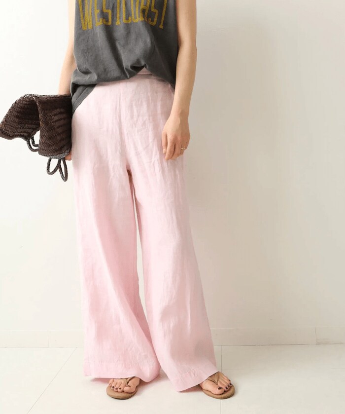 涼しげな表情でシーズンムードを高めるリネンのワイドパンツ。カットソーやシャツとさらっと合わせるだけで、大人のリラックススタイルを作ってくれるはずです。