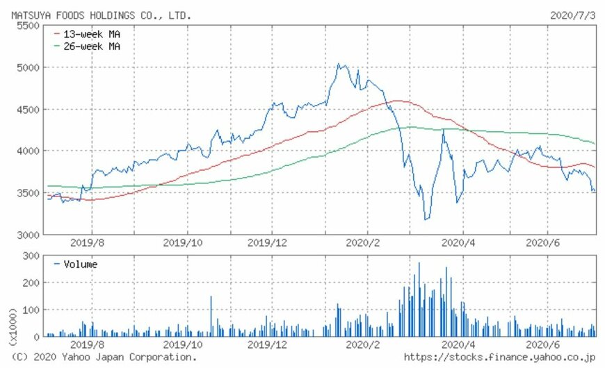 同社の株価は2019年7月から上昇が続き、2020年1月には5,130円の高値に到達しました。しかし反落し2月後半からの世界的な株価下落を背景に、3月13日には3,025円の安値を付けました。