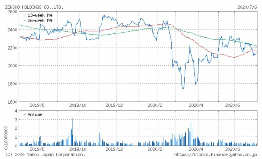 同社の2019年以降の株価は、2,500円台でいったん天井を付ける傾向にありました。2020年も1月に最高値2,535円を付けた後に下落を開始しています。ただし世界的な株価下落を受け、3月には1,677円まで下落。