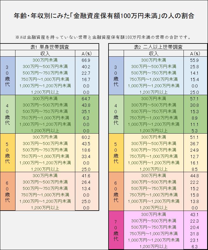 下の図は、そのデータを抜粋してまとめたもので、A欄は金融資産を持っていない世帯もしくは100万円未満の世帯が年代・収入別に占める割合を示しています。表1の30歳代・300万円未満の行に66.9%とあります。これは30歳代で収入が300万円未満の単身世帯のうち、66.9%が金融資産を持っていないことを示します。みなさんも自分の同世代・同収入ゾーンで、「100万円の金融資産を持っていない」人がどれくらいいるのかを確かめてみてください。
