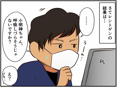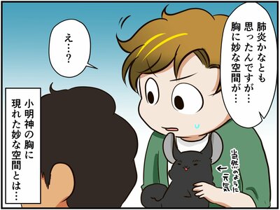 不正咬合の手術は成功したものの、痛みのために食事の量が減ってしまった小明神さん。飼い主の祭さんは、病院への通院のかたわら、小明神さんの体力を維持させようと、オリジナルスタイルでの『強制給餌』を開始しました(57話)。