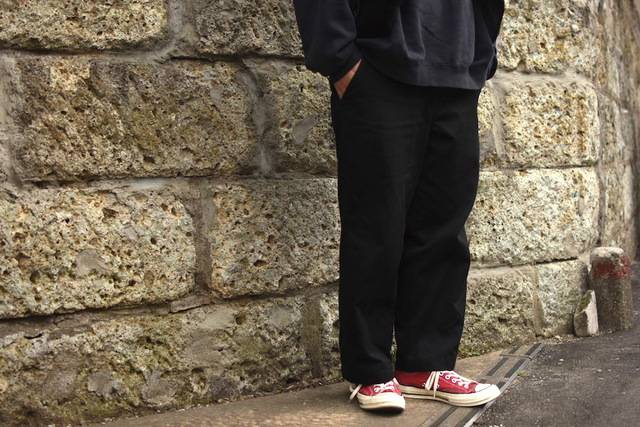 今回は無地の白Tとも相性の良い、黒のワークパンツをピックアップ。リーズナブルでお財布にも優しいワークパンツ、一本あると便利ですよ!