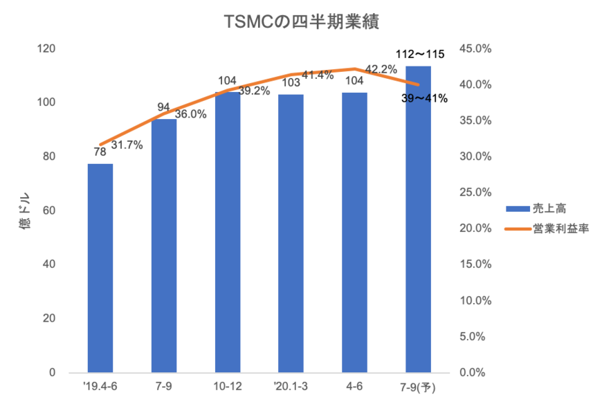 直近の20年4~6月期業績は、売上高が3107億台湾ドル(前四半期比横ばい/前年同期比29%増)、営業利益は1311億台湾ドル(同2%増/同72%増)となり、売上高はガイダンスのほぼ上限値となった。5GインフラおよびHPC分野の好調がその他セグメントの不調を相殺した。7~9月期はドルベースで112億~115億ドルを見込んでおり、中心値は前四半期比で9%増となる。