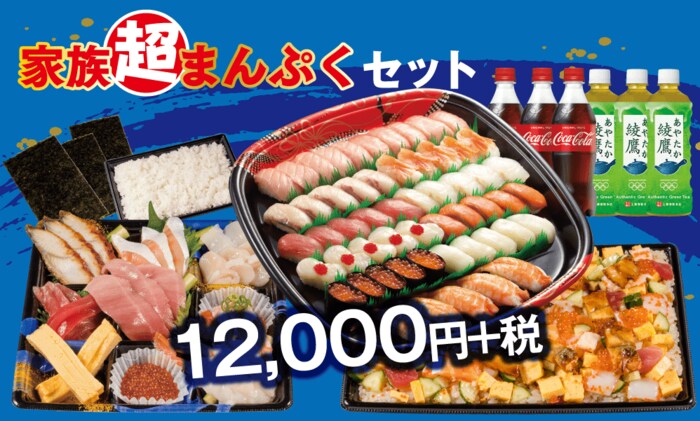 お持ち帰りの人気シリーズ「家族まんぷくセット」が“超”にパワーアップ!極みセット5人前+極み手巻き寿司セット3人前+極みチラシ寿司3人前にドリンク6本がついて12,000円(+税)。そしてお持ち帰りメニューのお会計金額が3,500円(税込)以上のお客様には、創業祭スクラッチカードをプレゼント。あなたの自宅へ「出張回転寿司」など豪華賞品もあるようです。