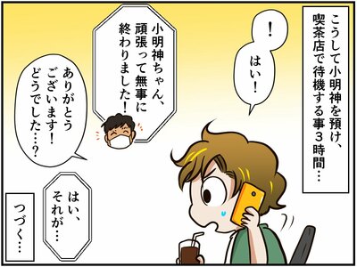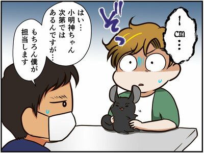 不正咬合の手術後の経過観察にて、胸に謎の空間があることを指摘された小明神さん。飼い主の祭さんは、さらに詳しい検査をするよう、先生に勧められます。しかし、その検査は、「麻酔なしで胸に針を刺し、謎の空間に入っているものを少しだけ取り出して分析する」というもの。連日の点滴で疲れ切っているであろう小明神さんには、体力的に少々厳しいように感じられる方法です。