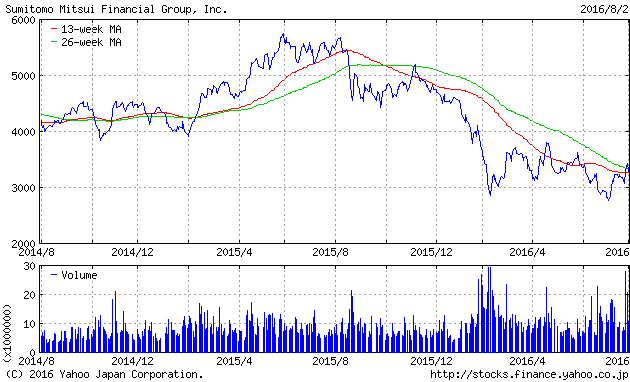 話を三井住友フィナンシャルグループ株に戻しますと、2016年のボックス圏である2,900円から3,800円までのレンジの上限までは株価が回復しても不思議はありません。