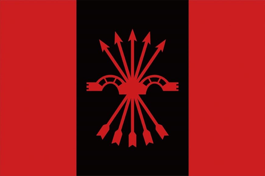 また、左右にある2本の柱の下に描かれた、くびき(車を引く牛や馬の首にかける横木)と5本の赤い矢の束は、フランコがつくったファシスト政党「ファランヘ党」の旗にも描かれた同党のシンボルです(別画像参照)。