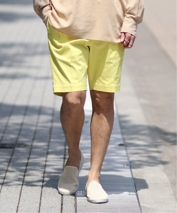 今シーズントレンドのライムイエローを取り入れた〈エディフィス〉のオリジナルショーツ。ガーメントダイで染めているため、少し洗いをかけたような風合いになり、“派手さ”が控えめになっているのがポイント。