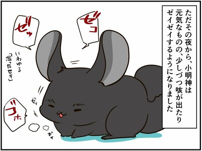 先生の話によると、病名は『胸腔膿瘍(きょうくうのうよう)』。しかし、チンチラのように小さな生物の場合、抗生物質を使って菌の増殖を抑えるしかなく、完治はしないとも…。