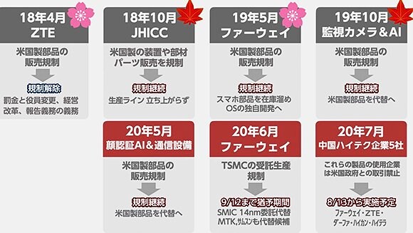 米国政府によるTSMCへの間接制裁(ハイシリコンからの受託生産の禁止処分)には、4カ月の猶予期間が設けられている。業界関係者は当初、この猶予期間内に米中関係に進展が見られ、制裁が緩和される方向に進むことを期待していた。しかし、その望みは叶わないもようだ。米中両国は関係修復の糸口を見出せないまま、5月下旬の全国人民代表大会の後さらに関係を悪化させている。TSMCの劉徳音CEOは7月中旬の株主会議で、9月14日以降もハイシリコンからの受託を受けない方針を決めたと語った。猶予期間内の根本解決はもはや望めない状況になった。