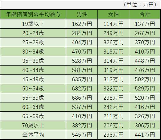 まずは男性の給与をみていきましょう。上の表1と表2を参照してください。男性の平均給与は545万円ですが、この金額を超えてくるのは40代に入ってからです。