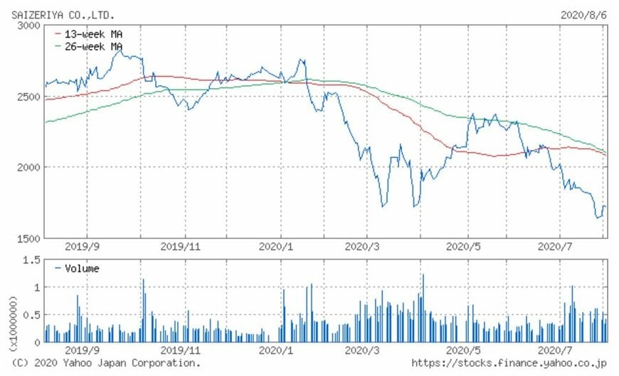 同社の株価は2019年から2,800円台を天井とする値動きが続き、2020年1月も2,811円到達後に反落しました。そして2月からの株式市場全体の急落を受け、4月には1,608円まで下落しています。その後、5月に2,300円台まで上昇したものの再度下落に転じ、現在は1,700円を前後する値動きを見せています。