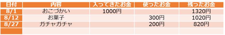 お金を管理するためには、数字で今いくらあるのか把握できるように、おこづかい帳をつけさせましょう。項目は、入ってきたお金、使ったお金、残ったお金の3項目に日付と何に使ったかを書く欄を設けます(表参照)。