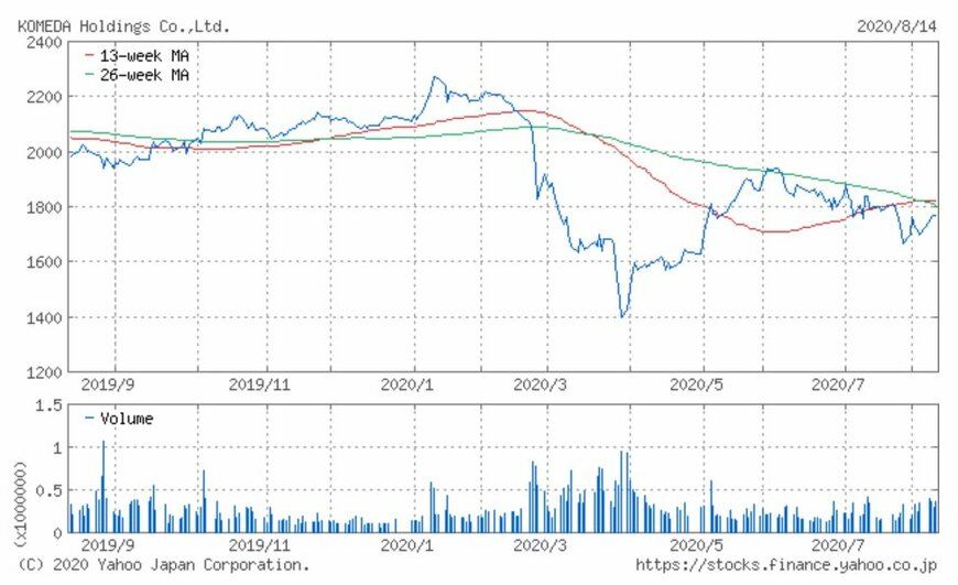 2019年の同社の株価は、概ね1,950円~2,150円間のレンジ相場が続きましたが、2020年1月にレンジ上限の2,150円を突破し2,296円に到達しました。しかし反落し2月後半からの株式市場全体の下落もあり、4月6日に1,316円まで下落しています。その後は反発し、現在は1,600-1,700円付近で取引されています。