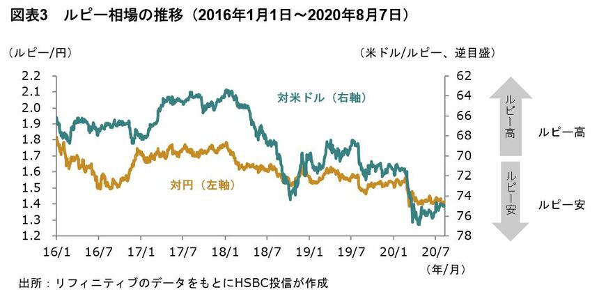 インドルピーは対米ドル、対円ともに、本年2月下旬から3月にかけて、新型コロナウィルスの感染者の世界的な広がりを受けた投資家のリスク回避志向の高まりを背景に、他の新興国通貨とともに急落した。その後は、対米ドルでは強含み、対円ではレンジ相場を続けている(8月7日現在)。