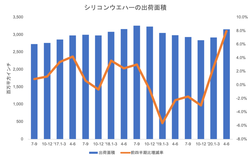 SEMIによれば、20年第2四半期のシリコンウエハー出荷面積は、前四半期比8%増の31億5200万平方インチと大きく増加。四半期ベースでは19年第4四半期を底に回復基調にあり、過去ピークに迫る水準となっている。直近の国内大手2社の四半期業績も堅調で、信越化学の売上高は前四半期比3%増、SUMCOは同4%増の伸びを見せた。