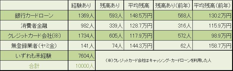 銀行カードローンや消費者金融、クレジットカード会社、無登録業者(ヤミ金)からお金を借りた経験がない人は約7600人。約2400人が借金の経験があり、今も借入残高のある人は約1600人です。