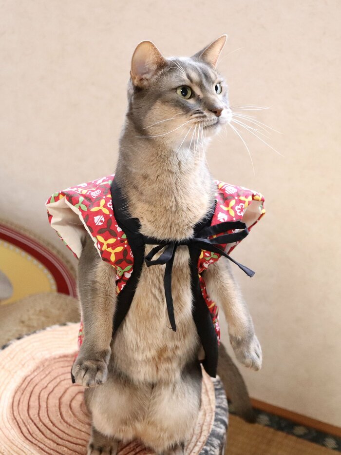 うんちの後はハイになって激しく暴れまわるというスルメさん(4歳)は、猫用おやつ「ちゅ~る」が大好き。冬のある日、かなさん(@misa12_25)は、ちゃんちゃんこを着たスルメさんに「ちゅ~る」をあげることに。