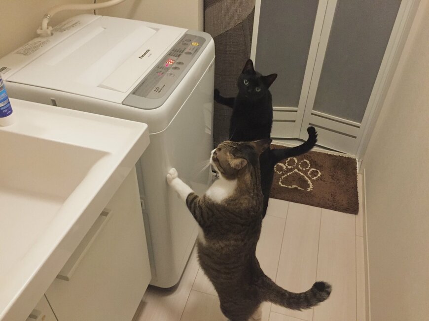 中でも力を注いでいるのが、洗濯機の監視。「最初は動いている洗濯機の上に登りたくても登れなかったラッキーがやりはじめ、そのうちにナイトも真似しはじめました。2匹とも洗濯機が止まると、すぐに上に登ります。」