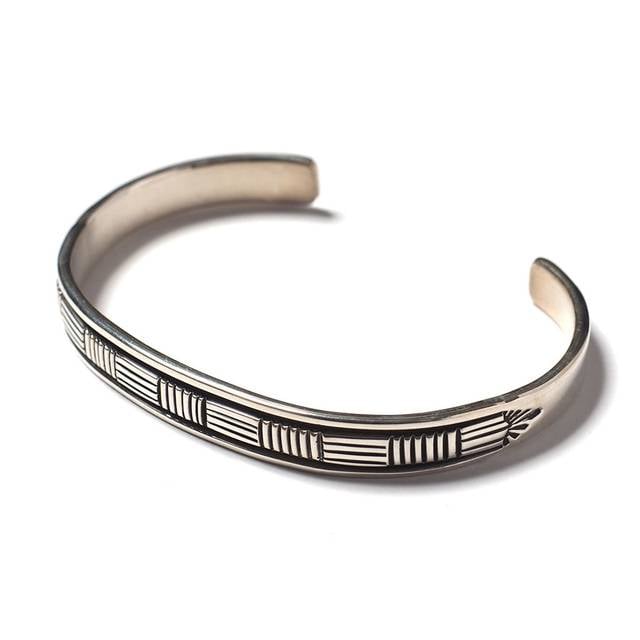 トップスが半袖ならば、手首からコーディネートを盛り上げるのも一つの手。インディアンジュエリーの定番、ナバホ族のアーティストによるバングルです。