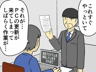 上司からの至急の書類の作成依頼。しかし、運悪く部下のPCが更新中に!「更新が終わるまで待っていただけますか?」という部下に、電源OFFして更新を中断させ、仕事を続けろと主張する上司…。