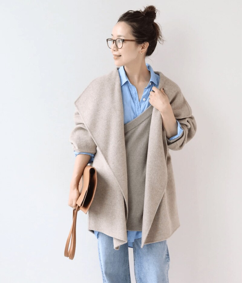 ショールを纏ったような大きな襟がポイントのミドルコートは、サッと羽織るだけで様見えが叶う優秀アイテム。柔らかく滑らかな肌触りとゆったりしたサイズ感で着心地も抜群! コート自体とても軽くて着脱も楽チン。