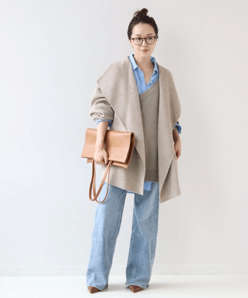 パステルなどのキレイ色は今年の秋冬の注目トレンド。淡いミントブルーなら甘過ぎず大人も挑戦しやすくて◎ 少し襟を抜くと、背中に丸いフォルムが生まれ抜け感を演出できます。