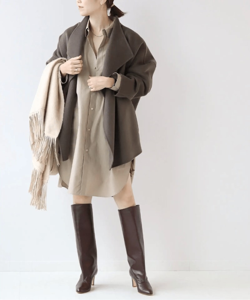 グレイッシュなカーキは大人っぽくこなれた雰囲気。アームホールにゆとりがあるので秋はブラウスやロンT、冬はスウェットやニットも楽々着込め、ロングシーズン活躍してくれます。ミドル丈ならこの秋冬トレンドのロングブーツ合わせも新鮮味アップ!