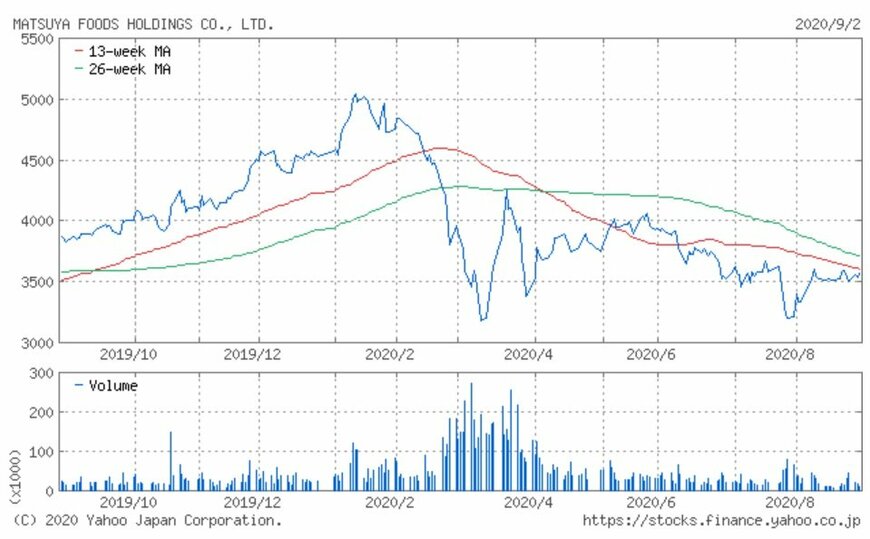 同社の株価は2019年7月から上昇が続き、2020年1月には5,130円の高値に到達しました。しかし反落し2月後半からの世界的な株価下落を背景に、3月13日には3,025円の安値を付けています。その後は反発し、5月に4,000円台を回復したものの再び下落に転じ、現在は3,500〜3,600円前後での取引が継続中です。