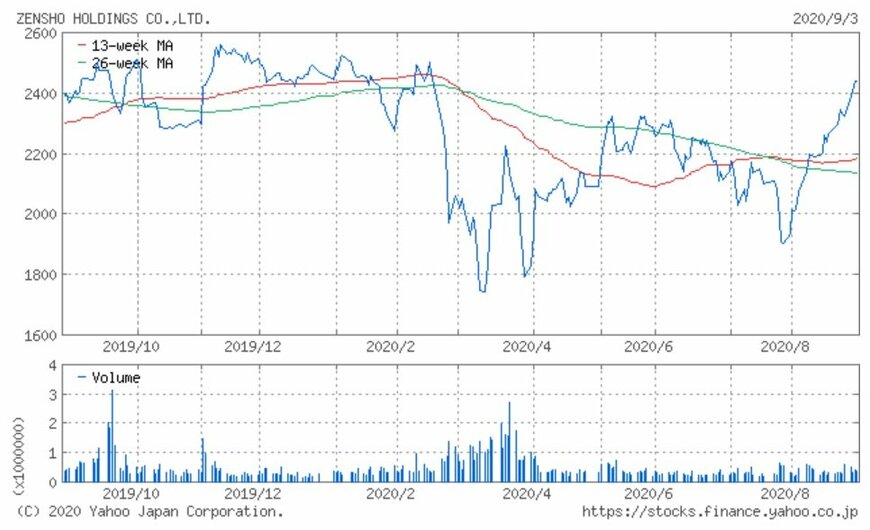同社の2019年以降の株価は、2,500円台で天井を付ける傾向にありました。2020年も1月に最高値2,535円を付けた後に下落を開始しています。ただし世界的な株価下落を受け、3月には1,677円まで下落。その後はN字型での上昇を見せており、9月に入り株価は2,400円台まで回復しています。